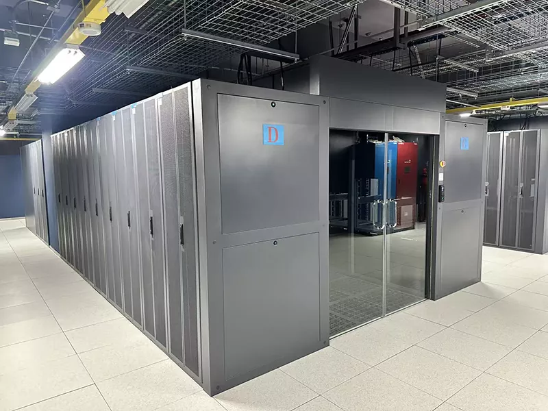 Конструкция с закрытым холодным коридором обеспечивает стабильную температуру приточного воздуха для серверных стоек, что подходит для мощных центров обработки данных с высокой плотностью размещения.